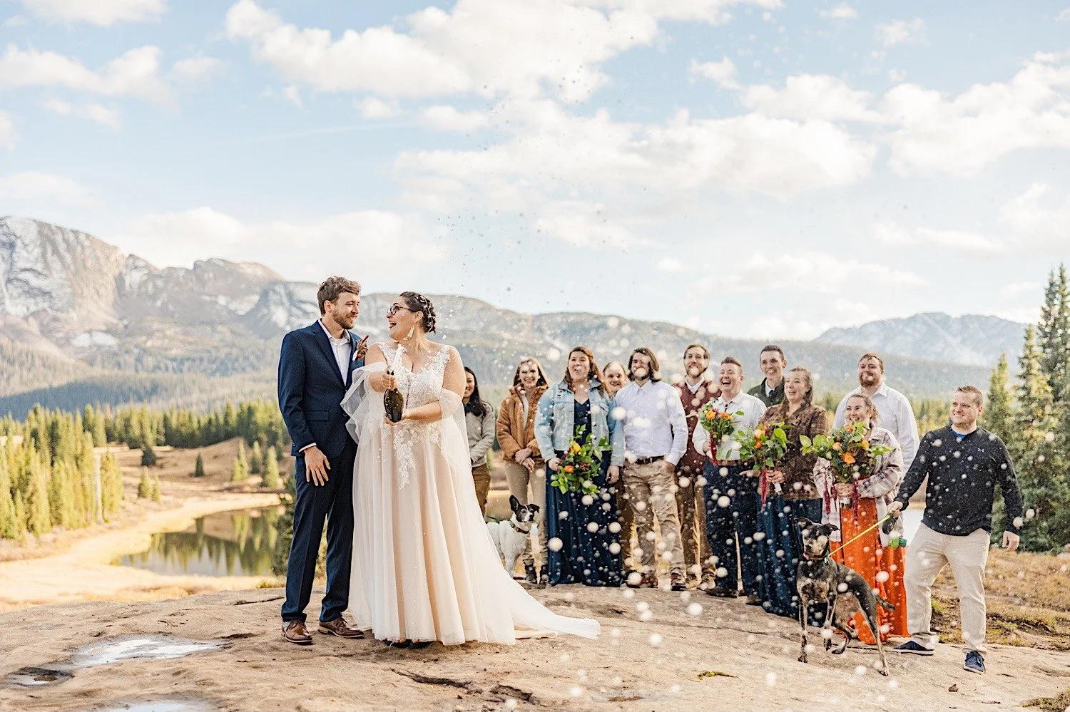 After the two had said their vows it was time to pop the champagne! With their friends around them, Nicolette and Frank were able to share a drink with all of their favorite people while surrounded by the stunning views of the mountains. Thanks to Colorado allowing self solemnization, Nicolette and Frank were able to sign their marriage license themselves and have one of their puppers sign as a witness! We had a bit of time for group portraits before Nicolette, Frank, and I headed out for some newlywed portraits. As the sun began to set on our second location, the fall colors of Colorado REALLY started to pop!! There’s a reason this is my favorite season for weddings and elopements!